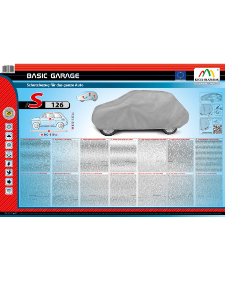 Vysoko kvalitná, celoročná plachta na auto BASIC GARAGE – vodovzdorná a paropriepustná. Vďaka spojeniu dvoch druhov materiálu si plachta zachováva takmer úplnú tesnosť dokonca aj pri intenzívnom daždi a zároveň, za kladnej teploty okolia, odvádza von vlhkosť hromadiacu sa pod plachtou. Plachta chráni celé auto spoločne s jeho dolnou časťou pred nepriaznivým vplyvom vonkajšieho prostredia. Je vyrobená z materiálu, na vnútornej strane hladkého, nepoškriabe karosériu. Upevňuje sa s pomocou sťahovacieho lemu s lankom okolo celého vozidla, v prípade správneho zaviazania zaručuje bezpečnosť aj počas nárazov vetra. Vďaka širokému spektru tvarov a veľkostí sú plachty z tohto radu (rovnako ako i naše iné plachty) dobre prispôsobené konkrétnym autám. Plachty Basic Garage majú overenú odolnosť proti slnku a iným atmosférickým faktorom, čo potvrdzuje písomná záruka 25 mesiacov priložená ku každému výrobku.