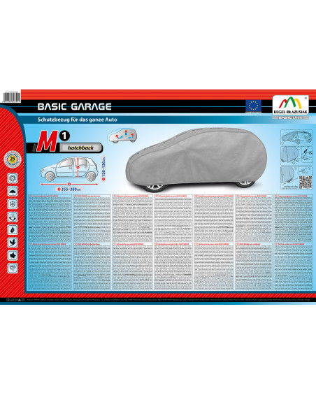 Vysoko kvalitná, celoročná plachta na auto BASIC GARAGE – vodovzdorná a paropriepustná. Vďaka spojeniu dvoch druhov materiálu si plachta zachováva takmer úplnú tesnosť dokonca aj pri intenzívnom daždi a zároveň, za kladnej teploty okolia, odvádza von vlhkosť hromadiacu sa pod plachtou. Plachta chráni celé auto spoločne s jeho dolnou časťou pred nepriaznivým vplyvom vonkajšieho prostredia. Je vyrobená z materiálu, na vnútornej strane hladkého, nepoškriabe karosériu. Upevňuje sa s pomocou sťahovacieho lemu s lankom okolo celého vozidla, v prípade správneho zaviazania zaručuje bezpečnosť aj počas nárazov vetra. Vďaka širokému spektru tvarov a veľkostí sú plachty z tohto radu (rovnako ako i naše iné plachty) dobre prispôsobené konkrétnym autám. Plachty Basic Garage majú overenú odolnosť proti slnku a iným atmosférickým faktorom, čo potvrdzuje písomná záruka 25 mesiacov priložená ku každému výrobku.