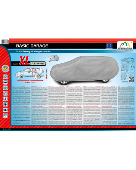 Vysoko kvalitná, celoročná plachta na auto BASIC GARAGE – vodovzdorná a paropriepustná. Vďaka spojeniu dvoch druhov materiálu si plachta zachováva takmer úplnú tesnosť dokonca aj pri intenzívnom daždi a zároveň, za kladnej teploty okolia, odvádza von vlhkosť hromadiacu sa pod plachtou. Plachta chráni celé auto spoločne s jeho dolnou časťou pred nepriaznivým vplyvom vonkajšieho prostredia. Je vyrobená z materiálu, na vnútornej strane hladkého, nepoškriabe karosériu. Upevňuje sa s pomocou sťahovacieho lemu s lankom okolo celého vozidla, v prípade správneho zaviazania zaručuje bezpečnosť aj počas nárazov vetra. Vďaka širokému spektru tvarov a veľkostí sú plachty z tohto radu (rovnako ako i naše iné plachty) dobre prispôsobené konkrétnym autám. Plachty Basic Garage majú overenú odolnosť proti slnku a iným atmosférickým faktorom, čo potvrdzuje písomná záruka 25 mesiacov priložená ku každému výrobku.