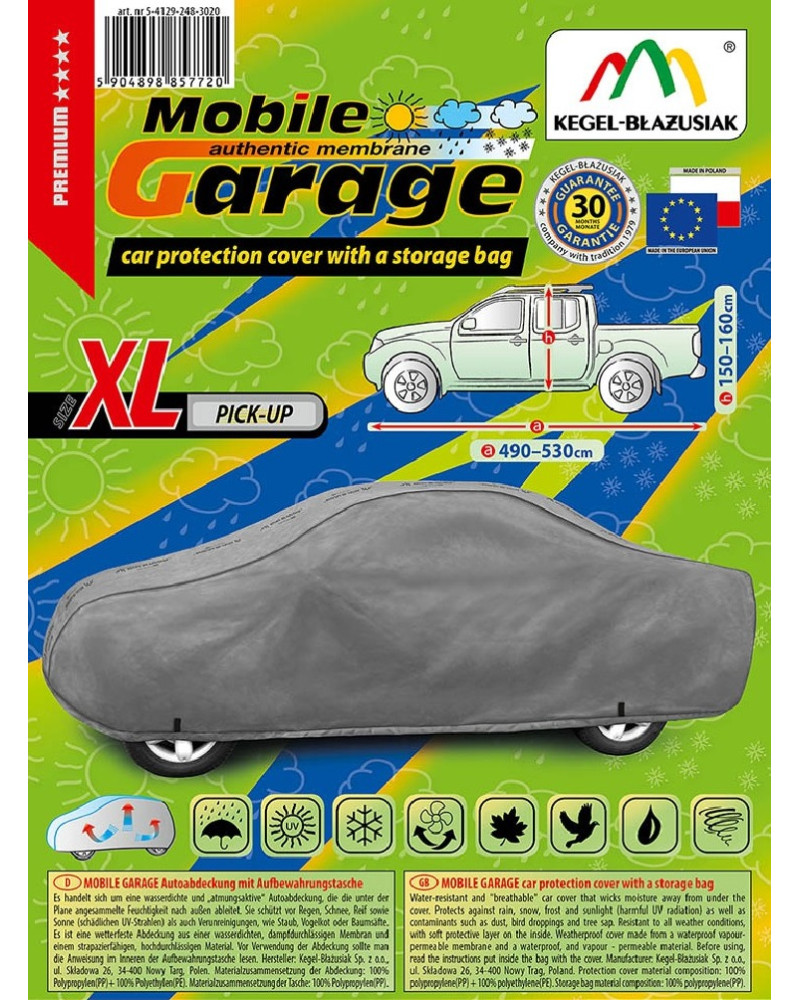 Vysoko kvalitné poťahy na auto MOBILE GARAGE- vodeodolné a paropriepustné. Vyrobené z nepremokavej, paropriepustnej membrány a neľahko premoknuteľných, vysoko paropriepustných materiálov si zachovávajú takmer úplnú tesnosť, a zároveň odvádzajú vlhkosť hromadiacu sa pod plachtou. Chránia celé auto spoločne s jeho dolnou časťou pred škodlivým vplyvom prostredia. Sú odolné voči pôsobeniu UV žiarenia. Pripevňujú sa pomocou sťahovača s lankom okolo celého vozidla, správne zaviazané zaisťujú bezpečnosť dokonca aj počas nárazového vetra. Vďaka širokému spektru tvarov a veľkostí sú plachty dobre prispôsobené rôznym autám. Poskytovaná záruka až 30 mesiacov vám dá istotu, že si kupujete výrobok najvyššej kvality.
