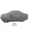 Je vyrobená z nesmierne stáleho a pevného materiálu vysokej kvality, ktorý sa vyznačuje mnohými výnimočnými vlastnosťami. Horný pás materiálu tiahnuci sa cez masku, strechu a batožinový priestor je vyrobený z štvorvrstvovej, vodeodolnej, paropriepustnej MEMBRÁNY a boky (2 vrstvy) z neľahko premoknuteľného, vysoko paropriepustného materiálu SPUNBOND. Špeciálne vlastnosti materiálu a vhodná konštrukcia plachty zaisťujú správny obeh vzduch vo vnútri plachty. Každá známka vlhkosti, ktorá sa hromadí pod plachtou, sa rýchlo odparí, čo umožňuje zamedziť hrdzaveniu auta. Z vnútornej strany plachty je materiál úplne hladký, bezpečný pre vozidlo, pretože nespôsobuje jeho poškrabanie ani odrenie laku a to dokonca ani pri silných nárazoch vetra. Plachta má popolavú farbu, ktorá je nesmierne praktická a zároveň skvele vyzerá. Stredom plachty prebieha nápis s názvom a logom firmy a s názvom materiálu, z ktorého bola vyrobená - to vám poskytuje záruku originality a vysokej kvality produktu. Produkt sa veľmi ľahko a rýchlo inštaluje. Plachta zakrýva celý povrch auta spolu s dolnými časťami, ľahko presahuje cez spodnú časť a vďaka sťahovaču s lankom okolo celého vozidla sa pevne prichytí k autu, čo zabraňuje posúvaniu plachty. Iba správne zaviazanie zaručuje odolnosť viazania. Po zložení plachta nezaberie príliš miesta, vďaka tomu ju môžete voziť so sebou.