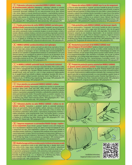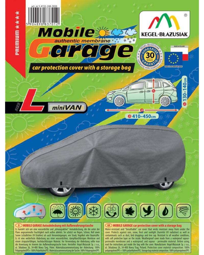 Vysoko kvalitné poťahy na auto MOBILE GARAGE- vodeodolné a paropriepustné. Vyrobené z nepremokavej, paropriepustnej membrány a neľahko premoknuteľných, vysoko paropriepustných materiálov si zachovávajú takmer úplnú tesnosť, a zároveň odvádzajú vlhkosť hromadiacu sa pod plachtou. Chránia celé auto spoločne s jeho dolnou časťou pred škodlivým vplyvom prostredia. Sú odolné voči pôsobeniu UV žiarenia. Pripevňujú sa pomocou sťahovača s lankom okolo celého vozidla, správne zaviazané zaisťujú bezpečnosť dokonca aj počas nárazového vetra. Vďaka širokému spektru tvarov a veľkostí sú plachty dobre prispôsobené rôznym autám. Poskytovaná záruka až 30 mesiacov vám dá istotu, že si kupujete výrobok najvyššej kvality.