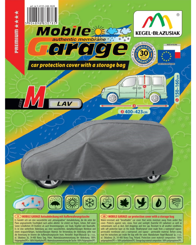 Vysoko kvalitné poťahy na auto MOBILE GARAGE- vodeodolné a paropriepustné. Vyrobené z nepremokavej, paropriepustnej membrány a neľahko premoknuteľných, vysoko paropriepustných materiálov si zachovávajú takmer úplnú tesnosť, a zároveň odvádzajú vlhkosť hromadiacu sa pod plachtou. Chránia celé auto spoločne s jeho dolnou časťou pred škodlivým vplyvom prostredia. Sú odolné voči pôsobeniu UV žiarenia. Pripevňujú sa pomocou sťahovača s lankom okolo celého vozidla, správne zaviazané zaisťujú bezpečnosť dokonca aj počas nárazového vetra. Vďaka širokému spektru tvarov a veľkostí sú plachty dobre prispôsobené rôznym autám. Poskytovaná záruka až 30 mesiacov vám dá istotu, že si kupujete výrobok najvyššej kvality.