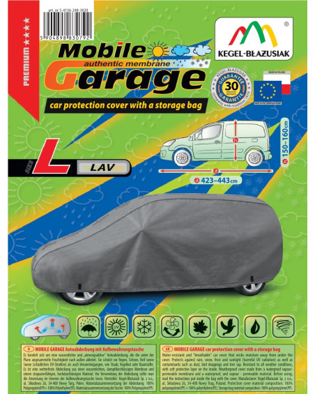 Vysoko kvalitné poťahy na auto MOBILE GARAGE- vodeodolné a paropriepustné. Vyrobené z nepremokavej, paropriepustnej membrány a neľahko premoknuteľných, vysoko paropriepustných materiálov si zachovávajú takmer úplnú tesnosť, a zároveň odvádzajú vlhkosť hromadiacu sa pod plachtou. Chránia celé auto spoločne s jeho dolnou časťou pred škodlivým vplyvom prostredia. Sú odolné voči pôsobeniu UV žiarenia. Pripevňujú sa pomocou sťahovača s lankom okolo celého vozidla, správne zaviazané zaisťujú bezpečnosť dokonca aj počas nárazového vetra. Vďaka širokému spektru tvarov a veľkostí sú plachty dobre prispôsobené rôznym autám. Poskytovaná záruka až 30 mesiacov vám dá istotu, že si kupujete výrobok najvyššej kvality.