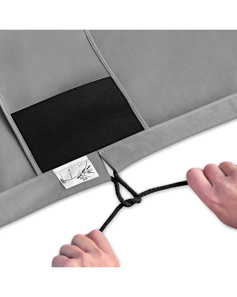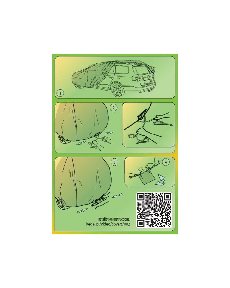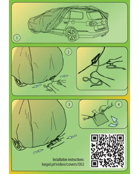 Pred nasadením plachty na auto sa odporúča sklopiť bočné zrkadlá a sklopiť alebo odskrutkovať anténu. Plachtu nasaďte na čisté a suché auto stranou plachty s potlačou von. Na uľahčenie správneho nasadenia plachty na aute je do plachty všitá nášivka FRONT vpredu na plachte a REAR vzadu na plachte (označenie sa kryje s prednou a zadnou časťou auta). Prekrížte lanká sťahovacieho lemu a vytvorte prvé prepletenie uzla, následne silno zatiahnite za lanká, silu smerujte paralelne so zadným okrajom vozidla (pozri obrázok 2 na vonkajšom štítku plachty). Zaviažte lanká sťahovacieho lemu a skontrolujte, či sa uzol po zatiahnutí za sťahovací lem neuvoľňuje. Pokiaľ sa uzol uvoľní, činnosť zopakujte a zmeňte pritom spôsob viazania. Prídavné lanká pretiahnite pútkami všitými do dolného okraja plachty vedľa kolies auta a pripevnite nimi plachtu k diskom auta (nepripevňujte k pukliciam).