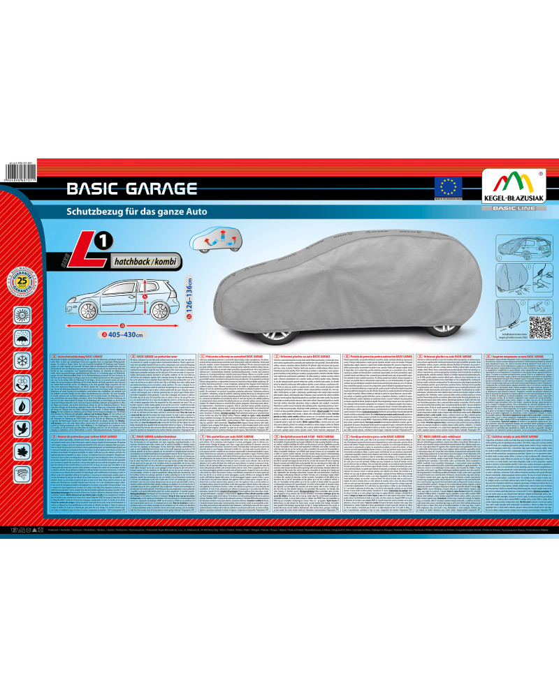 Vysoko kvalitná, celoročná plachta na auto BASIC GARAGE – vodovzdorná a paropriepustná. Vďaka spojeniu dvoch druhov materiálu si plachta zachováva takmer úplnú tesnosť dokonca aj pri intenzívnom daždi a zároveň, za kladnej teploty okolia, odvádza von vlhkosť hromadiacu sa pod plachtou. Plachta chráni celé auto spoločne s jeho dolnou časťou pred nepriaznivým vplyvom vonkajšieho prostredia. Je vyrobená z materiálu, na vnútornej strane hladkého, nepoškriabe karosériu. Upevňuje sa s pomocou sťahovacieho lemu s lankom okolo celého vozidla, v prípade správneho zaviazania zaručuje bezpečnosť aj počas nárazov vetra. Vďaka širokému spektru tvarov a veľkostí sú plachty z tohto radu (rovnako ako i naše iné plachty) dobre prispôsobené konkrétnym autám. Plachty Basic Garage majú overenú odolnosť proti slnku a iným atmosférickým faktorom, čo potvrdzuje písomná záruka 25 mesiacov priložená ku každému výrobku.