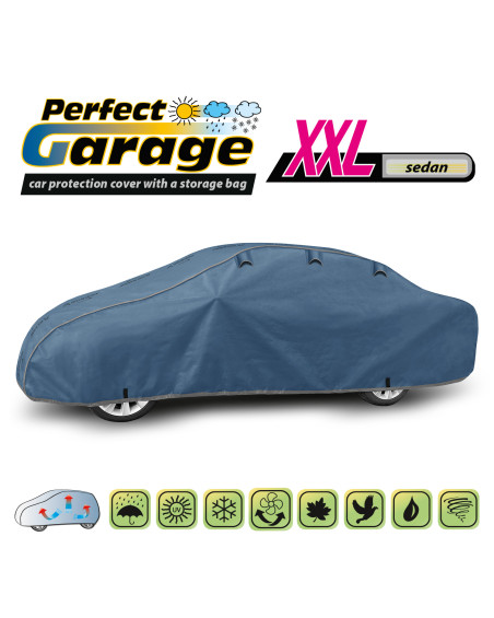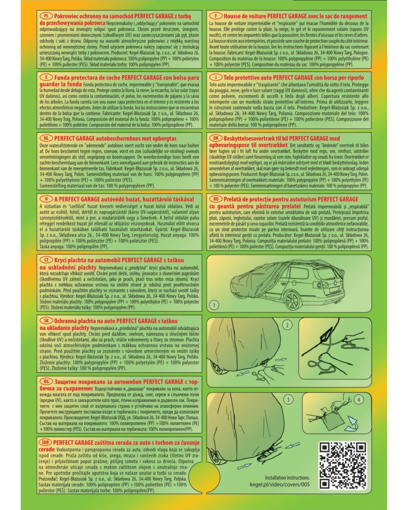 Plachta PERFECT GARAGE je dobre prispôsobená, pevne pripevnená s pomocou tradičného sťahovacieho lemu s lankom okolo celého auta, vyrobená zo silného a z vnútornej strany hladkého materiálu, vďaka tomu môže byť bezpečne používaná dokonca aj počas nárazového vetra. Ľahko sa nasadzuje a sťahuje. Po zložení nezaberie plachta príliš miesto, preto ju môžete vždy voziť so sebou. Poťah Perfect Garage vyrábame v elegantnej a estetickej tmavomodrej farbe, aby sme ho odlíšili od iných plachiet. Napriek tomu, že je tmavomodrá farba tmavá, má poťah PERFECT GARAGE ešte väčšiu odolnosť voči slnečnému žiareniu. Hornou časťou plachty prebieha nápis Kegel-Błażusiak KB Textil, aby potenciálni zákazníci, ktorí uvidia našu plachtu na zaparkovanom aute, vedeli, ako značku plachty hľadať.