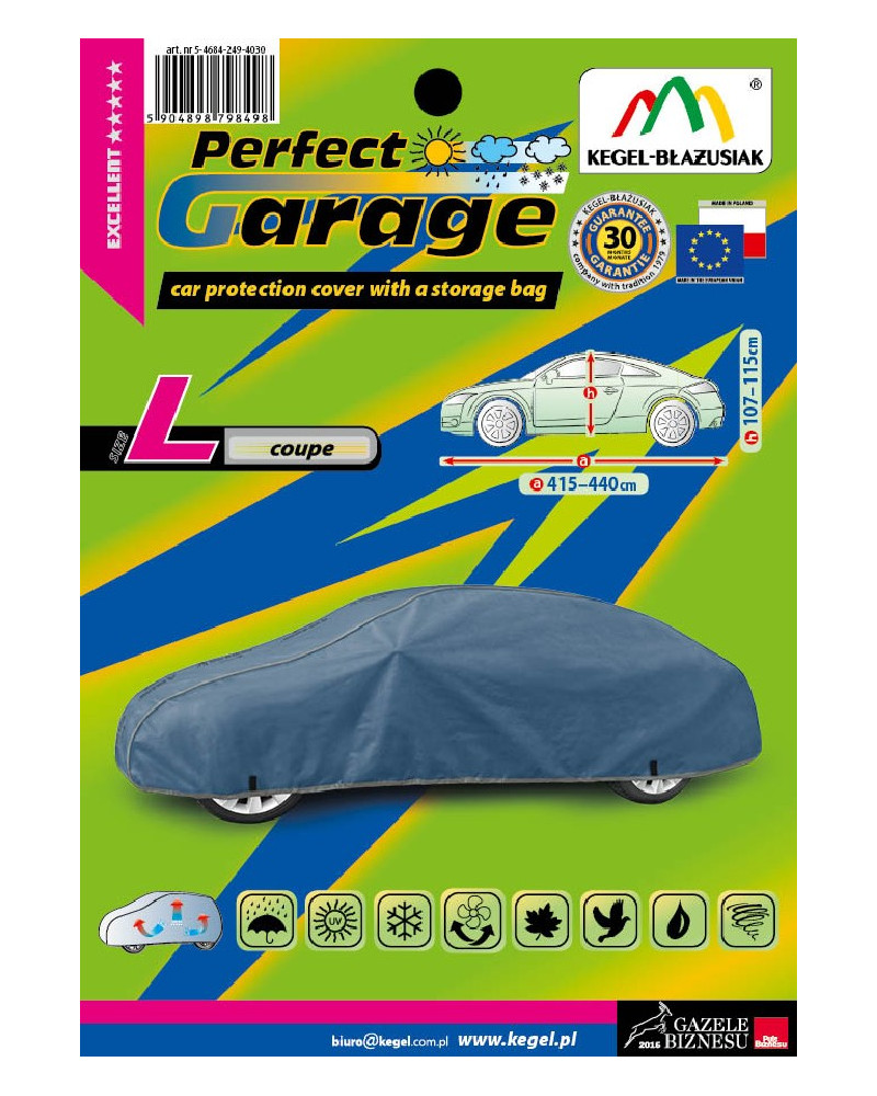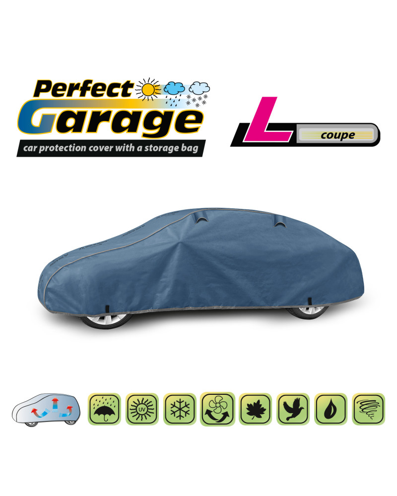 Plachta PERFECT GARAGE je dobre prispôsobená, pevne pripevnená s pomocou tradičného sťahovacieho lemu s lankom okolo celého auta, vyrobená zo silného a z vnútornej strany hladkého materiálu, vďaka tomu môže byť bezpečne používaná dokonca aj počas nárazového vetra. Ľahko sa nasadzuje a sťahuje. Po zložení nezaberie plachta príliš miesto, preto ju môžete vždy voziť so sebou. Poťah Perfect Garage vyrábame v elegantnej a estetickej tmavomodrej farbe, aby sme ho odlíšili od iných plachiet. Napriek tomu, že je tmavomodrá farba tmavá, má poťah PERFECT GARAGE ešte väčšiu odolnosť voči slnečnému žiareniu. Hornou časťou plachty prebieha nápis Kegel-Błażusiak KB Textil, aby potenciálni zákazníci, ktorí uvidia našu plachtu na zaparkovanom aute, vedeli, ako značku plachty hľadať.