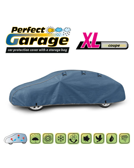 Plachta PERFECT GARAGE je dobre prispôsobená, pevne pripevnená s pomocou tradičného sťahovacieho lemu s lankom okolo celého auta, vyrobená zo silného a z vnútornej strany hladkého materiálu, vďaka tomu môže byť bezpečne používaná dokonca aj počas nárazového vetra. Ľahko sa nasadzuje a sťahuje. Po zložení nezaberie plachta príliš miesto, preto ju môžete vždy voziť so sebou. Poťah Perfect Garage vyrábame v elegantnej a estetickej tmavomodrej farbe, aby sme ho odlíšili od iných plachiet. Napriek tomu, že je tmavomodrá farba tmavá, má poťah PERFECT GARAGE ešte väčšiu odolnosť voči slnečnému žiareniu. Hornou časťou plachty prebieha nápis Kegel-Błażusiak KB Textil, aby potenciálni zákazníci, ktorí uvidia našu plachtu na zaparkovanom aute, vedeli, ako značku plachty hľadať.