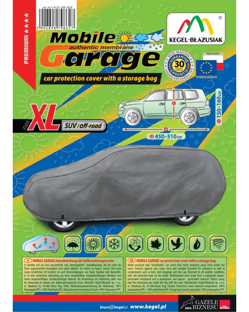 Vysoko kvalitné poťahy na auto MOBILE GARAGE- vodeodolné a paropriepustné. Vyrobené z nepremokavej, paropriepustnej membrány a neľahko premoknuteľných, vysoko paropriepustných materiálov si zachovávajú takmer úplnú tesnosť, a zároveň odvádzajú vlhkosť hromadiacu sa pod plachtou. Chránia celé auto spoločne s jeho dolnou časťou pred škodlivým vplyvom prostredia. Sú odolné voči pôsobeniu UV žiarenia. Pripevňujú sa pomocou sťahovača s lankom okolo celého vozidla, správne zaviazané zaisťujú bezpečnosť dokonca aj počas nárazového vetra. Vďaka širokému spektru tvarov a veľkostí sú plachty dobre prispôsobené rôznym autám. Poskytovaná záruka až 30 mesiacov vám dá istotu, že si kupujete výrobok najvyššej kvality.