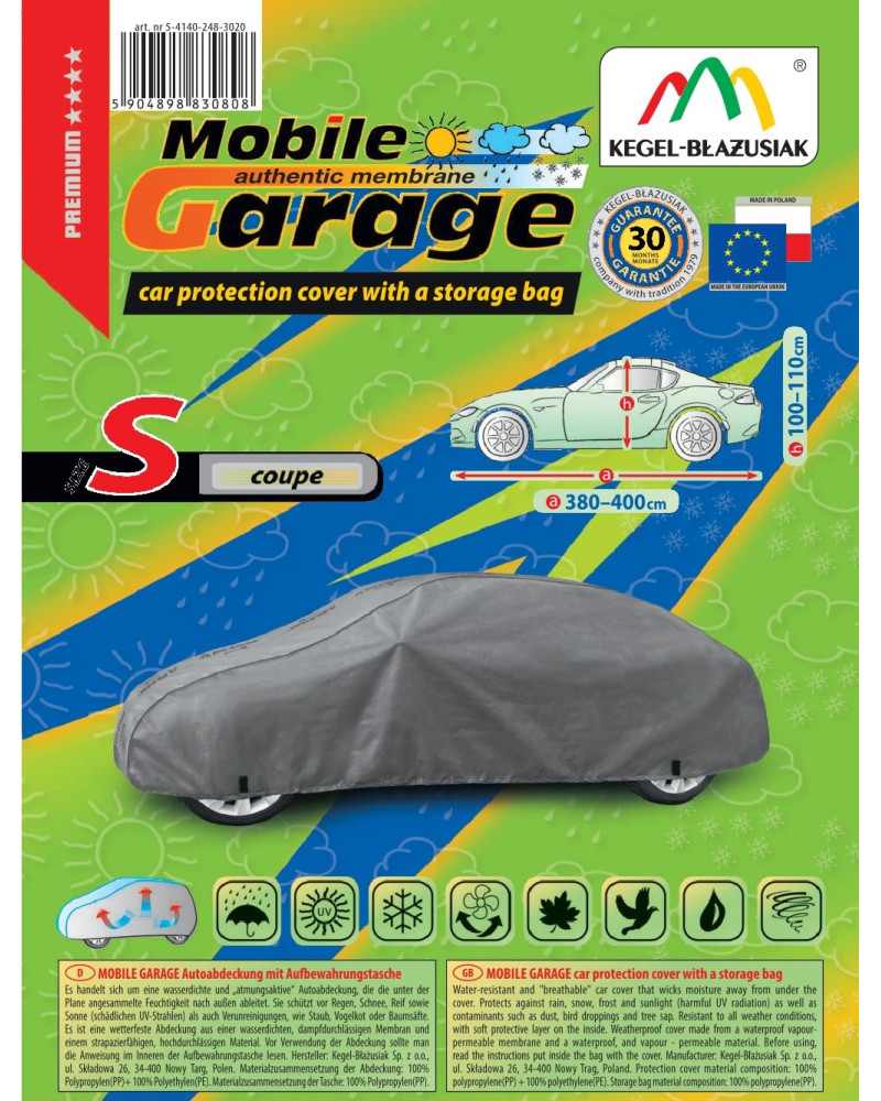 Vysoko kvalitné poťahy na auto MOBILE GARAGE- vodeodolné a paropriepustné. Vyrobené z nepremokavej, paropriepustnej membrány a neľahko premoknuteľných, vysoko paropriepustných materiálov si zachovávajú takmer úplnú tesnosť, a zároveň odvádzajú vlhkosť hromadiacu sa pod plachtou. Chránia celé auto spoločne s jeho dolnou časťou pred škodlivým vplyvom prostredia. Sú odolné voči pôsobeniu UV žiarenia. Pripevňujú sa pomocou sťahovača s lankom okolo celého vozidla, správne zaviazané zaisťujú bezpečnosť dokonca aj počas nárazového vetra. Vďaka širokému spektru tvarov a veľkostí sú plachty dobre prispôsobené rôznym autám. Poskytovaná záruka až 30 mesiacov vám dá istotu, že si kupujete výrobok najvyššej kvality.