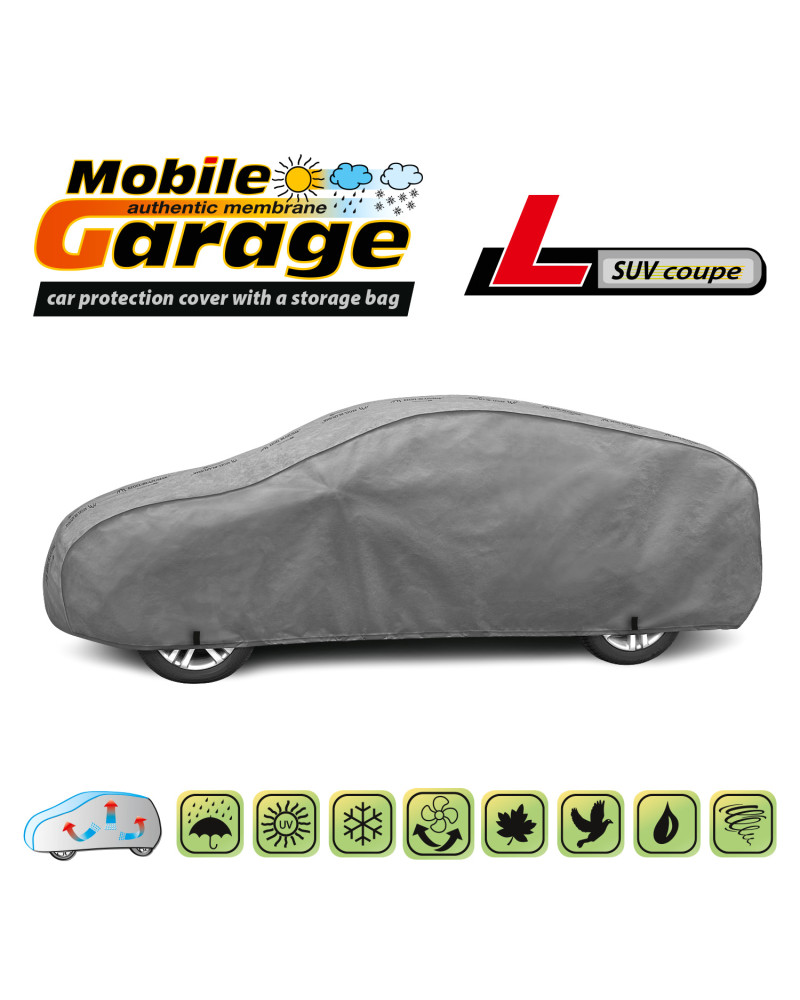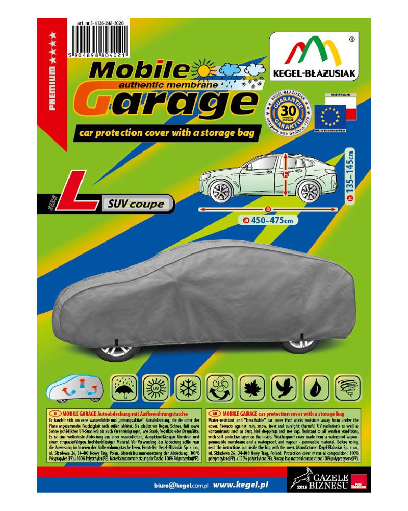 Vysoko kvalitné poťahy na auto MOBILE GARAGE- vodeodolné a paropriepustné. Vyrobené z nepremokavej, paropriepustnej membrány a neľahko premoknuteľných, vysoko paropriepustných materiálov si zachovávajú takmer úplnú tesnosť, a zároveň odvádzajú vlhkosť hromadiacu sa pod plachtou. Chránia celé auto spoločne s jeho dolnou časťou pred škodlivým vplyvom prostredia. Sú odolné voči pôsobeniu UV žiarenia. Pripevňujú sa pomocou sťahovača s lankom okolo celého vozidla, správne zaviazané zaisťujú bezpečnosť dokonca aj počas nárazového vetra. Vďaka širokému spektru tvarov a veľkostí sú plachty dobre prispôsobené rôznym autám. Poskytovaná záruka až 30 mesiacov vám dá istotu, že si kupujete výrobok najvyššej kvality.