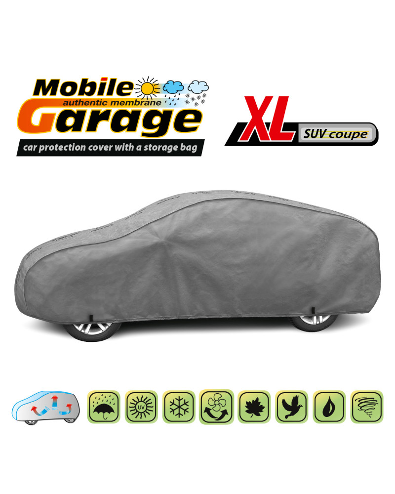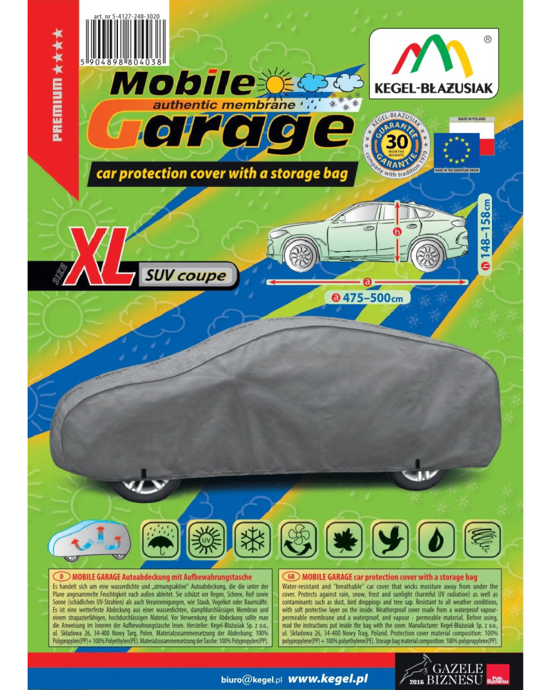 Vysoko kvalitné poťahy na auto MOBILE GARAGE- vodeodolné a paropriepustné. Vyrobené z nepremokavej, paropriepustnej membrány a neľahko premoknuteľných, vysoko paropriepustných materiálov si zachovávajú takmer úplnú tesnosť, a zároveň odvádzajú vlhkosť hromadiacu sa pod plachtou. Chránia celé auto spoločne s jeho dolnou časťou pred škodlivým vplyvom prostredia. Sú odolné voči pôsobeniu UV žiarenia. Pripevňujú sa pomocou sťahovača s lankom okolo celého vozidla, správne zaviazané zaisťujú bezpečnosť dokonca aj počas nárazového vetra. Vďaka širokému spektru tvarov a veľkostí sú plachty dobre prispôsobené rôznym autám. Poskytovaná záruka až 30 mesiacov vám dá istotu, že si kupujete výrobok najvyššej kvality.