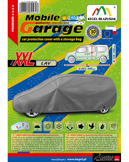 Vysoko kvalitné poťahy na auto MOBILE GARAGE- vodeodolné a paropriepustné. Vyrobené z nepremokavej, paropriepustnej membrány a neľahko premoknuteľných, vysoko paropriepustných materiálov si zachovávajú takmer úplnú tesnosť, a zároveň odvádzajú vlhkosť hromadiacu sa pod plachtou. Chránia celé auto spoločne s jeho dolnou časťou pred škodlivým vplyvom prostredia. Sú odolné voči pôsobeniu UV žiarenia. Pripevňujú sa pomocou sťahovača s lankom okolo celého vozidla, správne zaviazané zaisťujú bezpečnosť dokonca aj počas nárazového vetra. Vďaka širokému spektru tvarov a veľkostí sú plachty dobre prispôsobené rôznym autám. Poskytovaná záruka až 30 mesiacov vám dá istotu, že si kupujete výrobok najvyššej kvality.