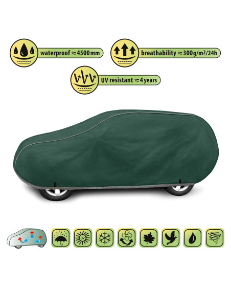 Membránová, vodotesná a zároveň paropriepustná plachta na auto Membrane Garage. Svoje vodotesné vlastnosti si udržiava aj pri silnom daždi a zároveň je paropriepustná, čím odvádza vlhkosť spod plachty. Plachta je odolná voči nepriaznivým vplyvom počasia a je vyrobená z vysoko paropriepustnej membrány. Chráni pred dažďom, snehom, mrazom a slnečnými lúčmi (škodlivým UV žiarením), ako aj nečistotami, ako je prach, vtáčí trus a miazga stromov.