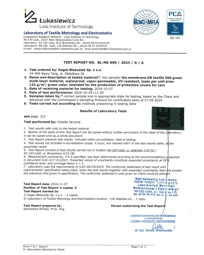 Dobré krycie plachty by mali nielen chrániť auto pred atmosférickými zrážkami, znečistením a slnečnými lúčmi, ale tiež by mali byť bezpečné. Práve také sú naše krycie plachty Tannenberg. Naši špecialisti robia dlhoročné testy našich krycích plachiet. Testuje sa účinnosť ochrany vozidiel krycou plachtou pred atmosférickými podmienkami a vodoodolnosť, odvádzanie vodnej pary spod plachty, bezpečnosť plachty pre lak vozidla a účinnosť pripevnenia plachty na vozidle za bežných a extrémnych poveternostných podmienok. Len výrobky, ktorých dlhodobé testy skončili pozitívne, sú potom vyrábané našou firmou Kegel-Błażusiak.