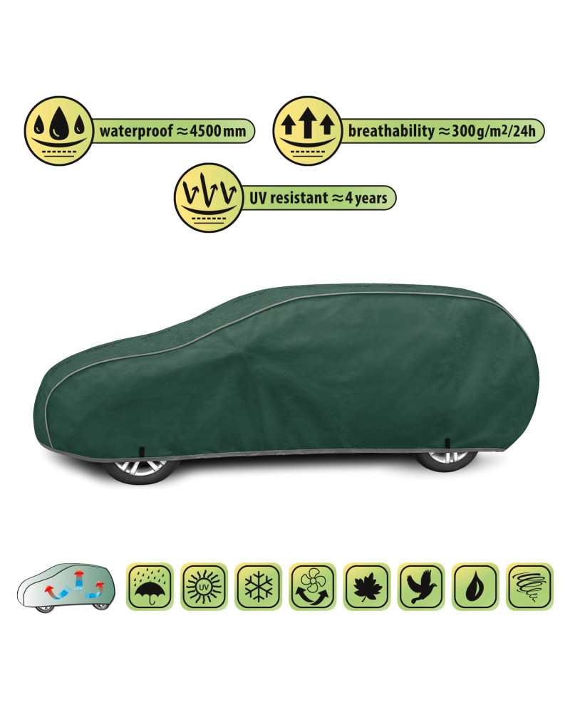 Membránová, vodotesná a zároveň paropriepustná plachta na auto Membrane Garage. Svoje vodotesné vlastnosti si udržiava aj pri silnom daždi a zároveň je paropriepustná, čím odvádza vlhkosť spod plachty. Plachta je odolná voči nepriaznivým vplyvom počasia a je vyrobená z vysoko paropriepustnej membrány. Chráni pred dažďom, snehom, mrazom a slnečnými lúčmi (škodlivým UV žiarením), ako aj nečistotami, ako je prach, vtáčí trus a miazga stromov.