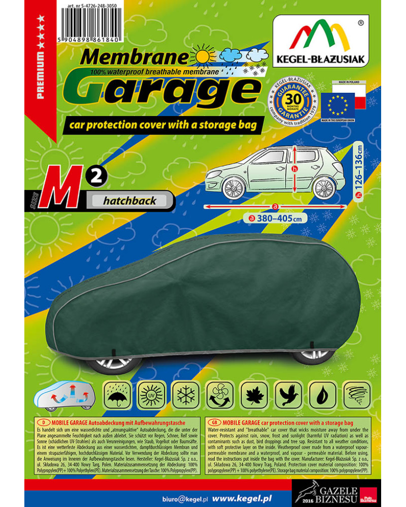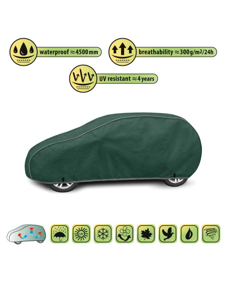 Membránová, vodotesná a zároveň paropriepustná plachta na auto Membrane Garage. Svoje vodotesné vlastnosti si udržiava aj pri silnom daždi a zároveň je paropriepustná, čím odvádza vlhkosť spod plachty. Plachta je odolná voči nepriaznivým vplyvom počasia a je vyrobená z vysoko paropriepustnej membrány. Chráni pred dažďom, snehom, mrazom a slnečnými lúčmi (škodlivým UV žiarením), ako aj nečistotami, ako je prach, vtáčí trus a miazga stromov.