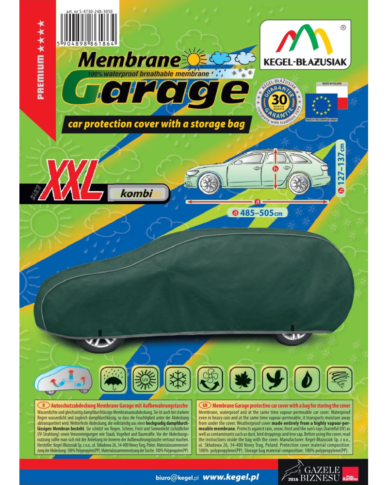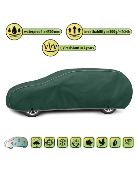 Membránová, vodotesná a zároveň paropriepustná plachta na auto Membrane Garage. Svoje vodotesné vlastnosti si udržiava aj pri silnom daždi a zároveň je paropriepustná, čím odvádza vlhkosť spod plachty. Plachta je odolná voči nepriaznivým vplyvom počasia a je vyrobená z vysoko paropriepustnej membrány. Chráni pred dažďom, snehom, mrazom a slnečnými lúčmi (škodlivým UV žiarením), ako aj nečistotami, ako je prach, vtáčí trus a miazga stromov.