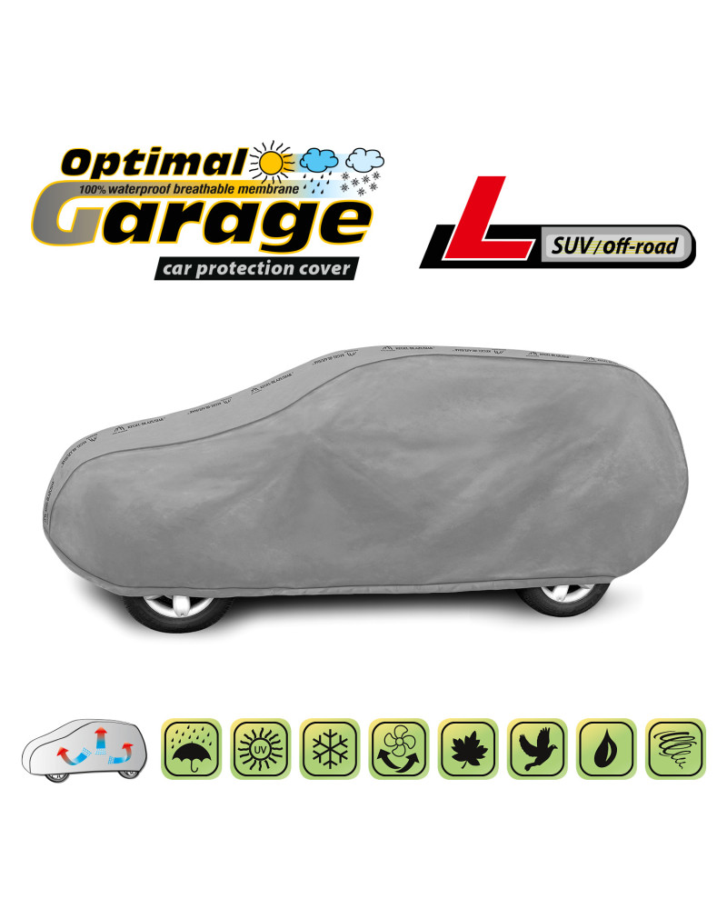 Membránová, vodotesná a zároveň paropriepustná plachta na auto OPTIMAL GARAGE. Svoje vodotesné vlastnosti si udržiava aj pri silnom daždi a zároveň je paropriepustná, čím odvádza vlhkosť spod plachty. Plachta je odolná voči nepriaznivým vplyvom počasia a je vyrobená z vysoko paropriepustnej membrány. Chráni pred dažďom, snehom, mrazom a slnečnými lúčmi (škodlivým UV žiarením), ako aj nečistotami, ako je prach, vtáčí trus a miazga stromov.
