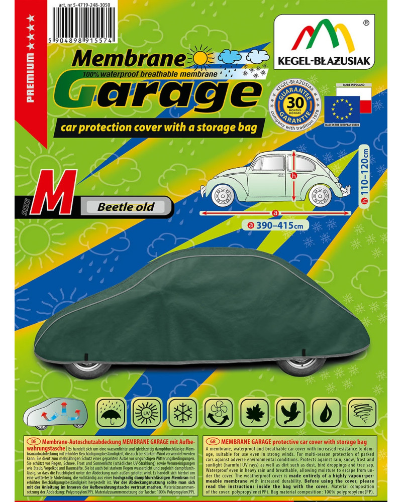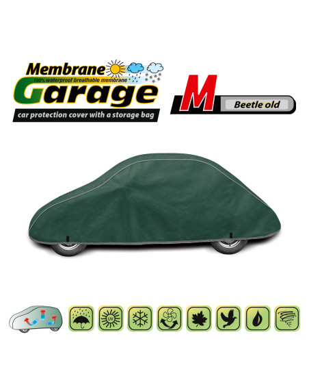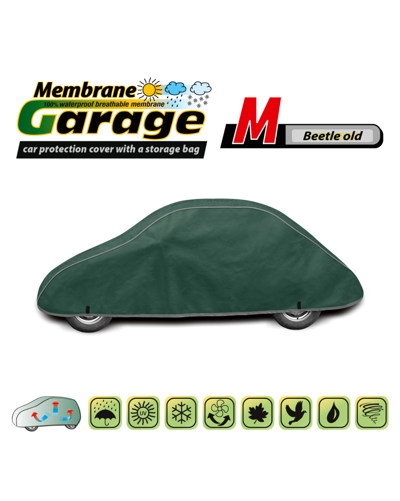 Membránová, vodotesná a zároveň paropriepustná plachta na auto Membrane Garage. Svoje vodotesné vlastnosti si udržiava aj pri silnom daždi a zároveň je paropriepustná, čím odvádza vlhkosť spod plachty. Plachta je odolná voči nepriaznivým vplyvom počasia a je vyrobená z vysoko paropriepustnej membrány. Chráni pred dažďom, snehom, mrazom a slnečnými lúčmi (škodlivým UV žiarením), ako aj nečistotami, ako je prach, vtáčí trus a miazga stromov.