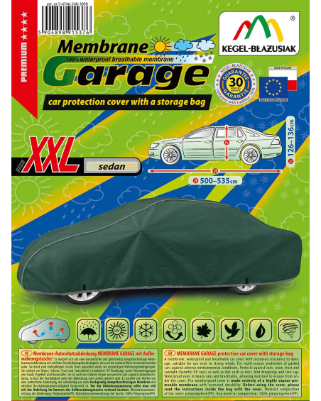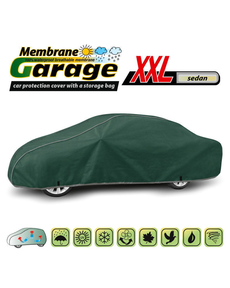 Membránová, vodotesná a zároveň paropriepustná plachta na auto Membrane Garage. Svoje vodotesné vlastnosti si udržiava aj pri silnom daždi a zároveň je paropriepustná, čím odvádza vlhkosť spod plachty. Plachta je odolná voči nepriaznivým vplyvom počasia a je vyrobená z vysoko paropriepustnej membrány. Chráni pred dažďom, snehom, mrazom a slnečnými lúčmi (škodlivým UV žiarením), ako aj nečistotami, ako je prach, vtáčí trus a miazga stromov.