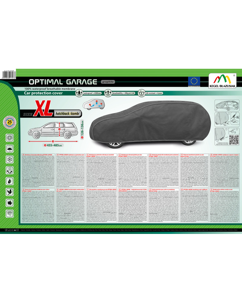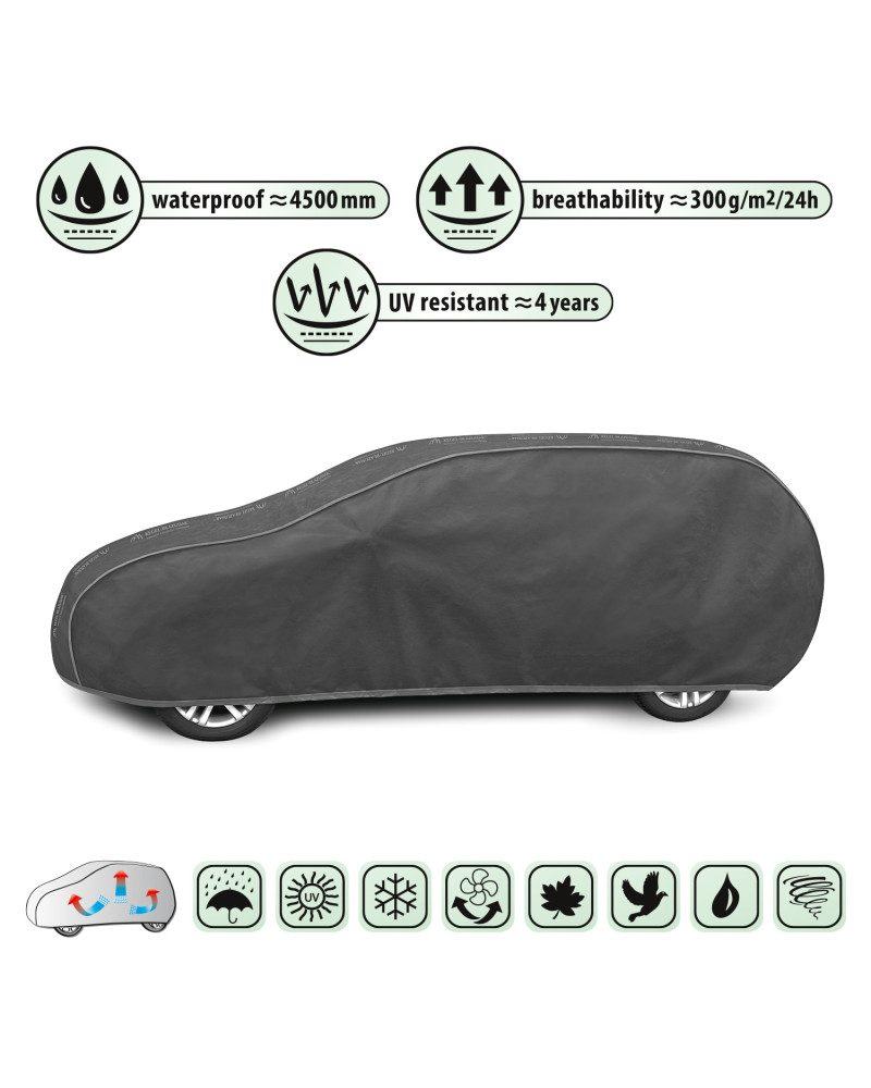 Membránová, vodotesná a zároveň paropriepustná plachta na auto OPTIMAL GARAGE. Svoje vodotesné vlastnosti si udržiava aj pri silnom daždi a zároveň je paropriepustná, čím odvádza vlhkosť spod plachty. Plachta je odolná voči nepriaznivým vplyvom počasia a je vyrobená z vysoko paropriepustnej membrány. Chráni pred dažďom, snehom, mrazom a slnečnými lúčmi (škodlivým UV žiarením), ako aj nečistotami, ako je prach, vtáčí trus a miazga stromov.