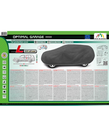 Membránová, vodotesná a zároveň paropriepustná plachta na auto OPTIMAL GARAGE. Svoje vodotesné vlastnosti si udržiava aj pri silnom daždi a zároveň je paropriepustná, čím odvádza vlhkosť spod plachty. Plachta je odolná voči nepriaznivým vplyvom počasia a je vyrobená z vysoko paropriepustnej membrány. Chráni pred dažďom, snehom, mrazom a slnečnými lúčmi (škodlivým UV žiarením), ako aj nečistotami, ako je prach, vtáčí trus a miazga stromov.