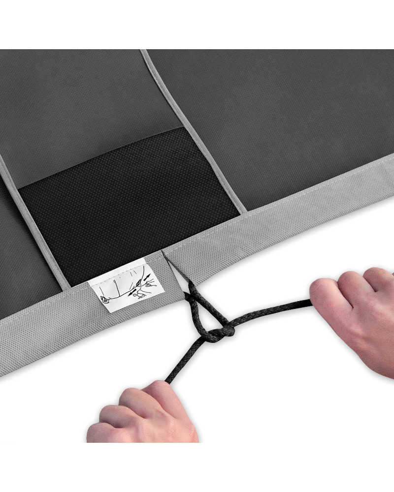 Pred nasadením plachty na auto sa odporúča sklopiť bočné zrkadlá a sklopiť alebo odskrutkovať anténu. Plachtu nasaďte na čisté a suché auto stranou plachty s potlačou von. Na uľahčenie správneho nasadenia plachty na aute je do plachty všitá nášivka FRONT vpredu na plachte a REAR vzadu na plachte (označenie sa kryje s prednou a zadnou časťou auta). Prekrížte lanká sťahovacieho lemu a vytvorte prvé prepletenie uzla, následne silno zatiahnite za lanká, silu smerujte paralelne so zadným okrajom vozidla (pozri obrázok 2 na vonkajšom štítku plachty). Zaviažte lanká sťahovacieho lemu a skontrolujte, či sa uzol po zatiahnutí za sťahovací lem neuvoľňuje. Pokiaľ sa uzol uvoľní, činnosť zopakujte a zmeňte pritom spôsob viazania. Prídavné lanká pretiahnite pútkami všitými do dolného okraja plachty vedľa kolies auta a pripevnite nimi plachtu k diskom auta (nepripevňujte k pukliciam).