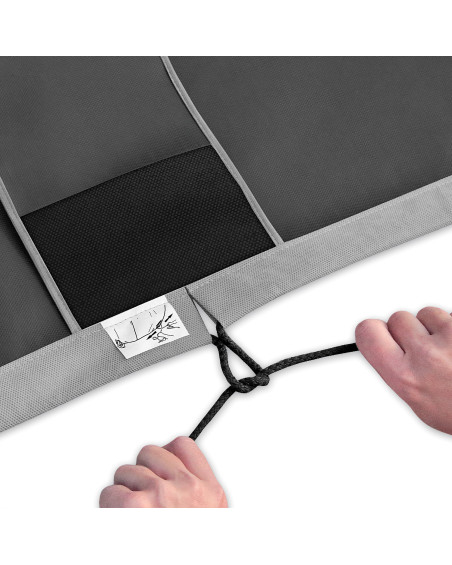 Pred nasadením plachty na auto sa odporúča sklopiť bočné zrkadlá a sklopiť alebo odskrutkovať anténu. Plachtu nasaďte na čisté a suché auto stranou plachty s potlačou von. Na uľahčenie správneho nasadenia plachty na aute je do plachty všitá nášivka FRONT vpredu plachty a REAR vzadu na plachte (označenie sa kryje s prednou a zadnou časťou auta). Následne zatiahnite a zaviažte lanká spodného sťahovacieho lemu plachty, venujte pozornosť tomu, aby ste pred zatiahnutím prekrížili lanká sťahovacieho lemu a vytvorili prvé prepletenie uzla, a následne silne zatiahnite lanká, silu smerujte paralelne so zadnou hranou vozidla (pozri obrázok 2). Zaviažte lanká sťahovacieho lemu a skontrolujte, či sa uzol po zatiahnutí za sťahovací lem neuvoľňuje. Pokiaľ sa uzol uvoľní, činnosť zopakujte a zmeňte pritom spôsob viazania.