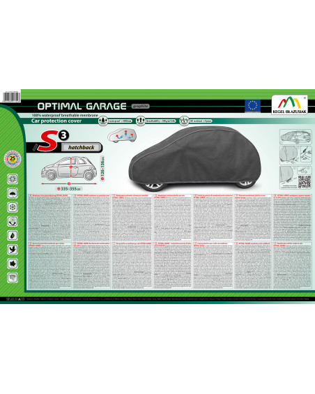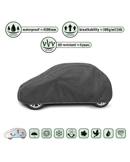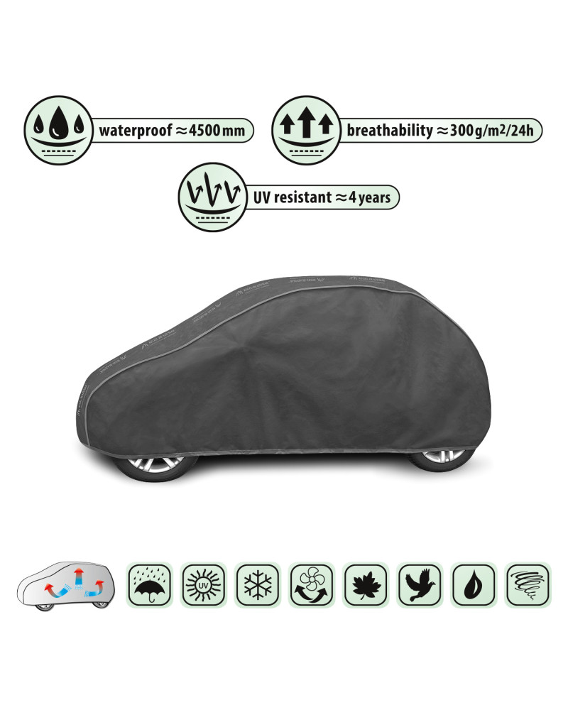 Membránová, vodotesná a zároveň paropriepustná plachta na auto OPTIMAL GARAGE. Svoje vodotesné vlastnosti si udržiava aj pri silnom daždi a zároveň je paropriepustná, čím odvádza vlhkosť spod plachty. Plachta je odolná voči nepriaznivým vplyvom počasia a je vyrobená z vysoko paropriepustnej membrány. Chráni pred dažďom, snehom, mrazom a slnečnými lúčmi (škodlivým UV žiarením), ako aj nečistotami, ako je prach, vtáčí trus a miazga stromov.
