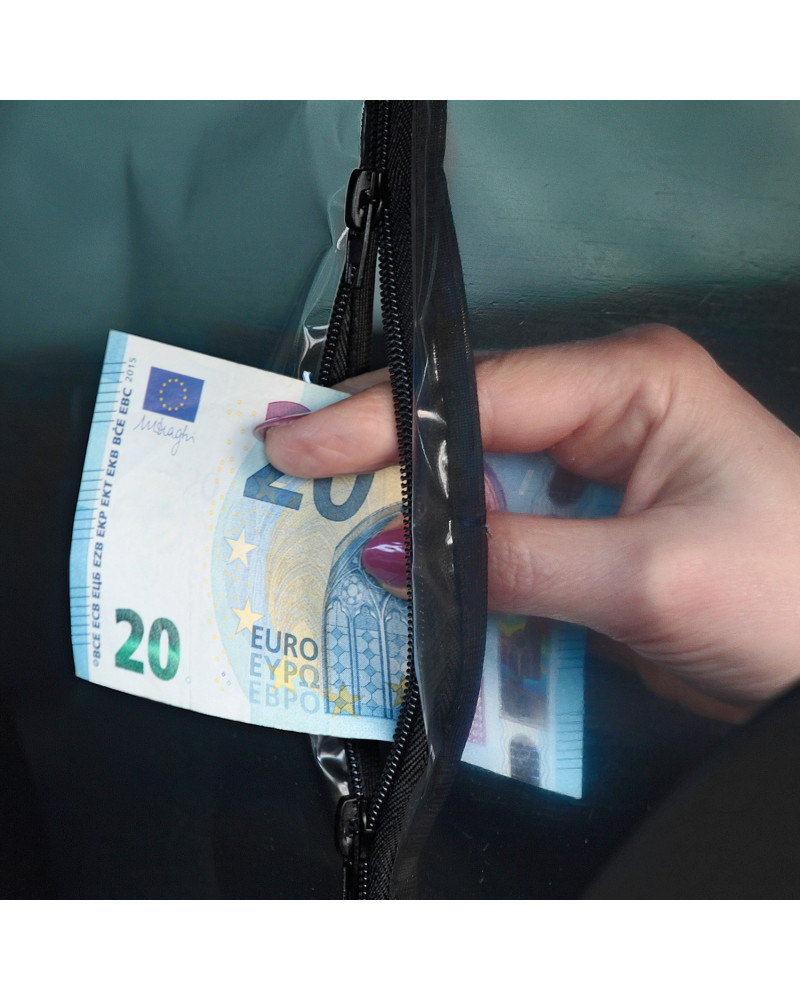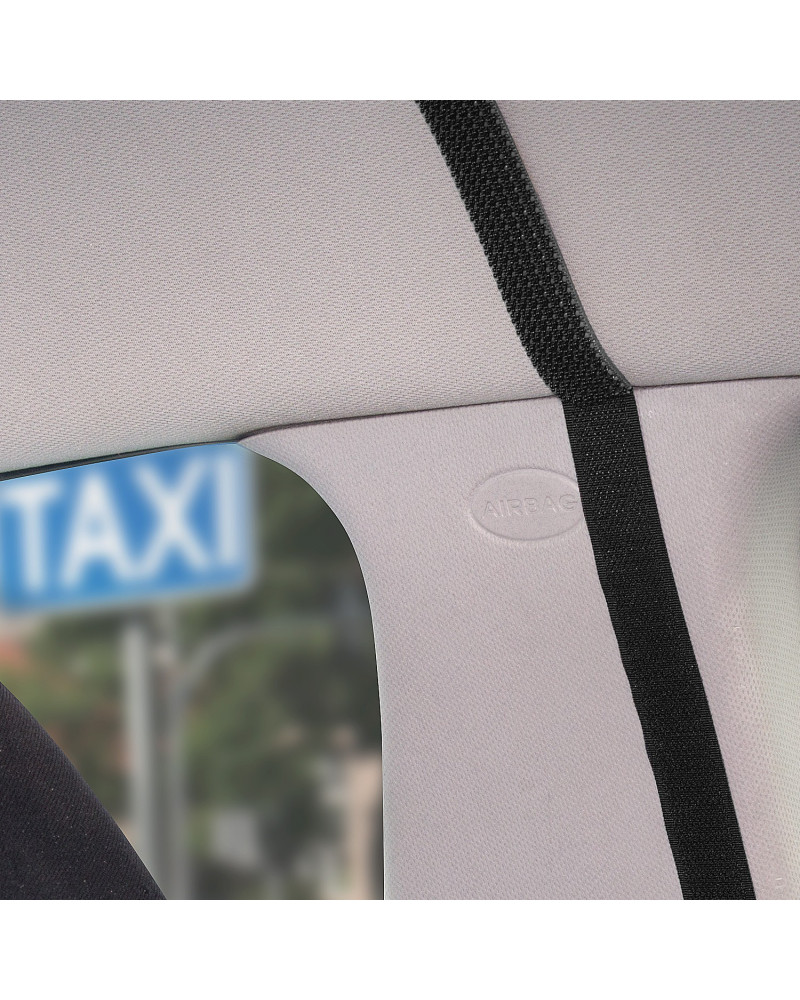 POZOR: Sila lepenia môže byť tak veľká, že nemusí byť možné opätovné odlepenie priemyselnej pásky so suchým zipsom bez poškodenia povrchu, na ktorom bola nalepená. Zástenu umiestnite v aute za prednými sedadlami tak, aby sa horná časť označená nášivkou Kegel-Błażusiak ocitla hore. Následne začnite zástenu pripevňovať zhora, pritlačte pásku suchého zipsu zásteny k páskam so suchým zipsom prilepeným k stropu a stĺpikom auta. Pokiaľ sa zástena ukáže byť príliš veľká, urobte na mieste stĺpikov auta záložky nariasením pásky zásteny so suchým zipsom. V dolnej časti zásteny otvorte zips tak, aby vznikol zodpovedajúci otvor pre stredový tunel v podlahe auta. Na pripevňujúcu slučku nasaďte háčiky, ktoré sú súčasťou balenia. Následne dolnú časť zásteny zasuňte pod sedadlá a pripevnite k spodnej konštrukcii sedadla s pomocou háčikov. Protiľahlým rozsúvaním zipsu sa tvorí štrbina, cez ktorú môže vodič prijať platbu od cestujúcich sediacich na zadnom sedadle.