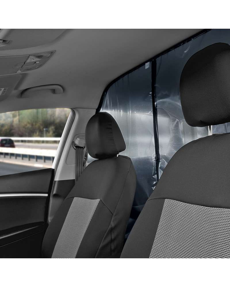 Priehľadná zástena oddeľujúca priestor vodiča (dve predné sedadlá) od priestoru pre cestujúcich (zadné sedadlo). S otváracou a nastaviteľnou štrbinou na strane vodiča umožňujúcou prijatie platby. Cez zástenu, bez nutnosti jej rozopínania, možno prijať bezkontaktné platby kartou. Pri správnom nasadení zástena v aute vytvorí priehradku s vysokou tesnosťou. Zástenu možno dezinfikovať všeobecne dostupnými dezinfekčnými kvapalinami a čistiť voľne dostupnými čistiacimi prostriedkami. Jednoduchá montáž bez použitia náradia s pomocou priemyselnej samolepiacej pásky so suchým zipsom a silnej samolepiacej pásky so suchým zipsom.