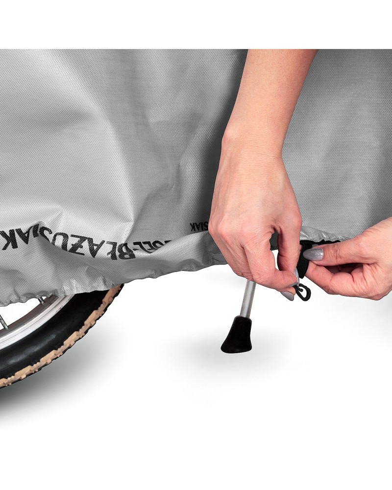 Plachtu naneste na čisté bicykle spôsobom prezentovaným na fotografii. S pomocou priloženého háčika zopnite slučku pripevňujúcu plachtu pod rámami bicyklov.