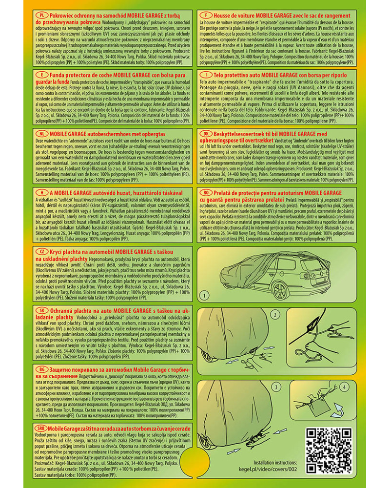 Vysoko kvalitné poťahy na auto MOBILE GARAGE- vodeodolné a paropriepustné. Vyrobené z nepremokavej, paropriepustnej membrány a neľahko premoknuteľných, vysoko paropriepustných materiálov si zachovávajú takmer úplnú tesnosť, a zároveň odvádzajú vlhkosť hromadiacu sa pod plachtou. Chránia celé auto spoločne s jeho dolnou časťou pred škodlivým vplyvom prostredia. Sú odolné voči pôsobeniu UV žiarenia. Pripevňujú sa pomocou sťahovača s lankom okolo celého vozidla, správne zaviazané zaisťujú bezpečnosť dokonca aj počas nárazového vetra. Vďaka širokému spektru tvarov a veľkostí sú plachty dobre prispôsobené rôznym autám. Poskytovaná záruka až 30 mesiacov vám dá istotu, že si kupujete výrobok najvyššej kvality.