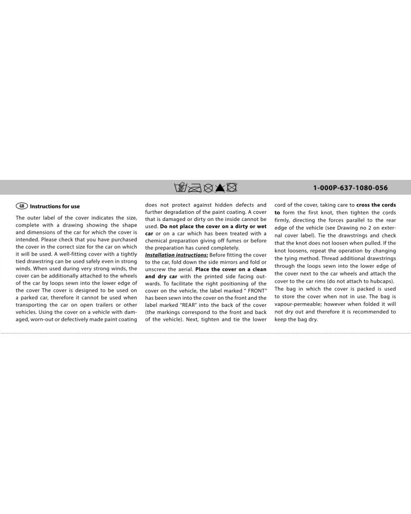 Pred nasadením plachty na auto sa odporúča sklopiť bočné zrkadlá a sklopiť alebo odskrutkovať anténu. Plachtu nasaďte na čisté a suché auto stranou plachty s potlačou von. Na uľahčenie správneho nasadenia plachty na aute je do plachty všitá nášivka FRONT vpredu na plachte a REAR vzadu na plachte (označenie sa kryje s prednou a zadnou časťou auta). Prekrížte lanká sťahovacieho lemu a vytvorte prvé prepletenie uzla, následne silno zatiahnite za lanká, silu smerujte paralelne so zadným okrajom vozidla (pozri obrázok 2 na vonkajšom štítku plachty). Zaviažte lanká sťahovacieho lemu a skontrolujte, či sa uzol po zatiahnutí za sťahovací lem neuvoľňuje. Pokiaľ sa uzol uvoľní, činnosť zopakujte a zmeňte pritom spôsob viazania. Prídavné lanká pretiahnite pútkami všitými do dolného okraja plachty vedľa kolies auta a pripevnite nimi plachtu k diskom auta (nepripevňujte k pukliciam).