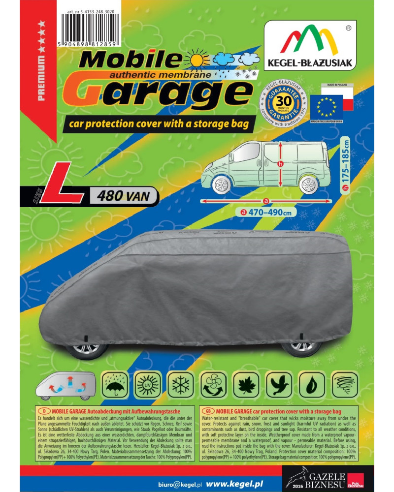 Vysoko kvalitné poťahy na auto MOBILE GARAGE- vodeodolné a paropriepustné. Vyrobené z nepremokavej, paropriepustnej membrány a neľahko premoknuteľných, vysoko paropriepustných materiálov si zachovávajú takmer úplnú tesnosť, a zároveň odvádzajú vlhkosť hromadiacu sa pod plachtou. Chránia celé auto spoločne s jeho dolnou časťou pred škodlivým vplyvom prostredia. Sú odolné voči pôsobeniu UV žiarenia. Pripevňujú sa pomocou sťahovača s lankom okolo celého vozidla, správne zaviazané zaisťujú bezpečnosť dokonca aj počas nárazového vetra. Vďaka širokému spektru tvarov a veľkostí sú plachty dobre prispôsobené rôznym autám. Poskytovaná záruka až 30 mesiacov vám dá istotu, že si kupujete výrobok najvyššej kvality.