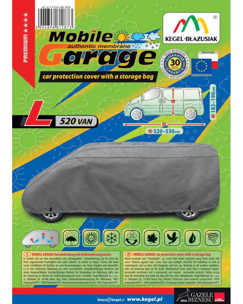 Vysoko kvalitné poťahy na auto MOBILE GARAGE- vodeodolné a paropriepustné. Vyrobené z nepremokavej, paropriepustnej membrány a neľahko premoknuteľných, vysoko paropriepustných materiálov si zachovávajú takmer úplnú tesnosť, a zároveň odvádzajú vlhkosť hromadiacu sa pod plachtou. Chránia celé auto spoločne s jeho dolnou časťou pred škodlivým vplyvom prostredia. Sú odolné voči pôsobeniu UV žiarenia. Pripevňujú sa pomocou sťahovača s lankom okolo celého vozidla, správne zaviazané zaisťujú bezpečnosť dokonca aj počas nárazového vetra. Vďaka širokému spektru tvarov a veľkostí sú plachty dobre prispôsobené rôznym autám. Poskytovaná záruka až 30 mesiacov vám dá istotu, že si kupujete výrobok najvyššej kvality.