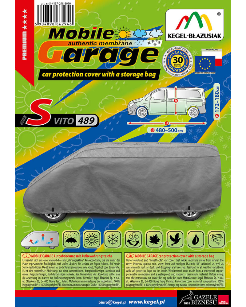 Vysoko kvalitné poťahy na auto MOBILE GARAGE- vodeodolné a paropriepustné. Vyrobené z nepremokavej, paropriepustnej membrány a neľahko premoknuteľných, vysoko paropriepustných materiálov si zachovávajú takmer úplnú tesnosť, a zároveň odvádzajú vlhkosť hromadiacu sa pod plachtou. Chránia celé auto spoločne s jeho dolnou časťou pred škodlivým vplyvom prostredia. Sú odolné voči pôsobeniu UV žiarenia. Pripevňujú sa pomocou sťahovača s lankom okolo celého vozidla, správne zaviazané zaisťujú bezpečnosť dokonca aj počas nárazového vetra. Vďaka širokému spektru tvarov a veľkostí sú plachty dobre prispôsobené rôznym autám. Poskytovaná záruka až 30 mesiacov vám dá istotu, že si kupujete výrobok najvyššej kvality.