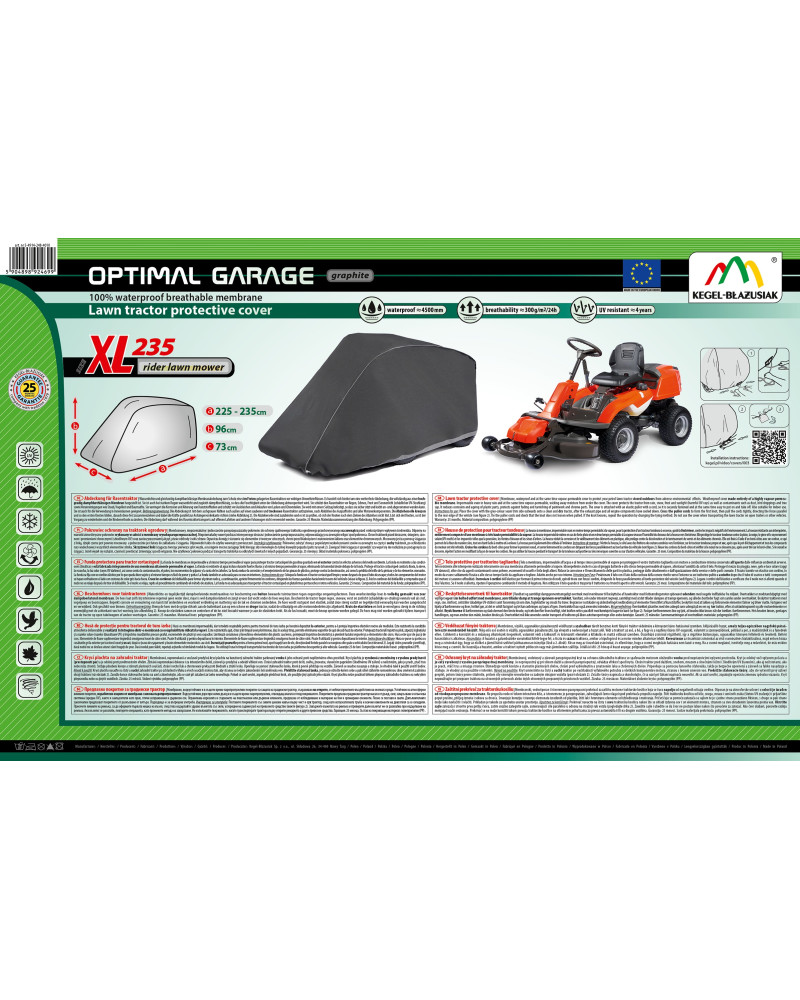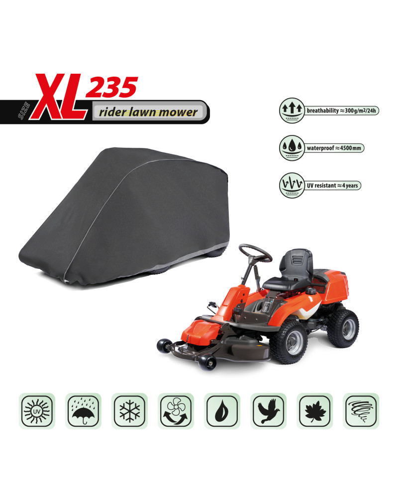 Celoročný ochranný kryt na ochranu kosačky so spaľovacím motorom, ktorá je uložená vonku, pred nepriaznivými vplyvmi počasia. Vďaka špeciálnej konštrukcii tohto krytu, voda pri daždi steká po tomto kryte bez toho, aby prenikla pod kryt. Chráni kosačku pred dažďom, snehom, mrazom a slnečným žiarením (škodlivým UV žiarením), ako aj pred nečistotami, ako je prach, vtáčí trus a miazga stromov. Znižuje riziko korózie a rýchlosť starnutia plastových častí, chráni pred vyblednutím a zmatnením laku a chrómových častí. Poťah je plne odolný voči všetkým nepriaznivým vplyvom počasia.