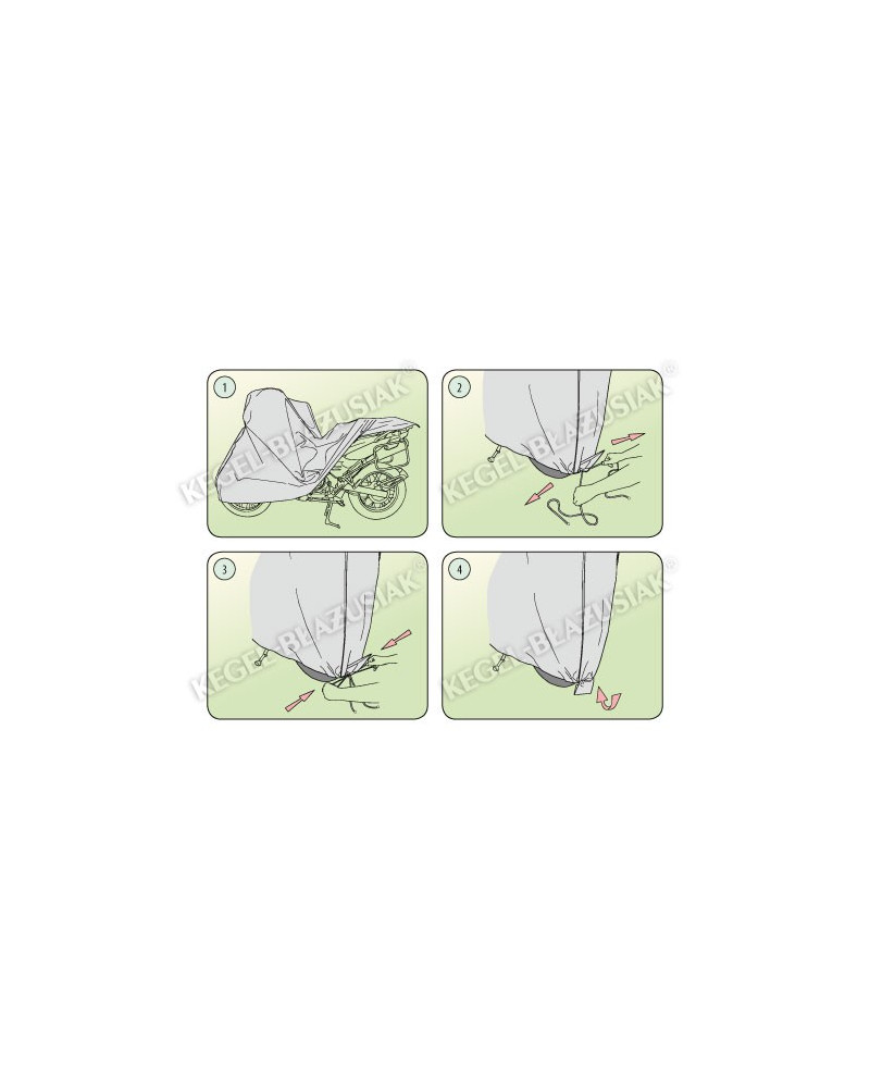 Plachtu nasaďte na čistý motocykel (stranou s potlačou von) tak, ako na fotografii, po vychladnutí výfukovej rúrky a iných súčastí motora. Prekrížte lanká sťahovacieho lemu a silne ich zatiahnite, sily smerujte paralelne k zadnej časti motocyklu (viď obrázok č. 2). Zaviažte lanká sťahovacieho lemu a skontrolujte, či sa uzol po zatiahnutí za sťahovací lem neuvoľňuje. Pokiaľ sa uzol uvoľní, činnosť zopakujte a zmeňte pritom spôsob viazania.