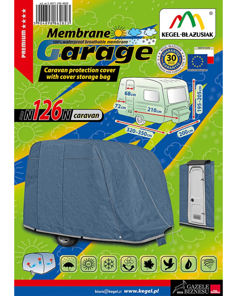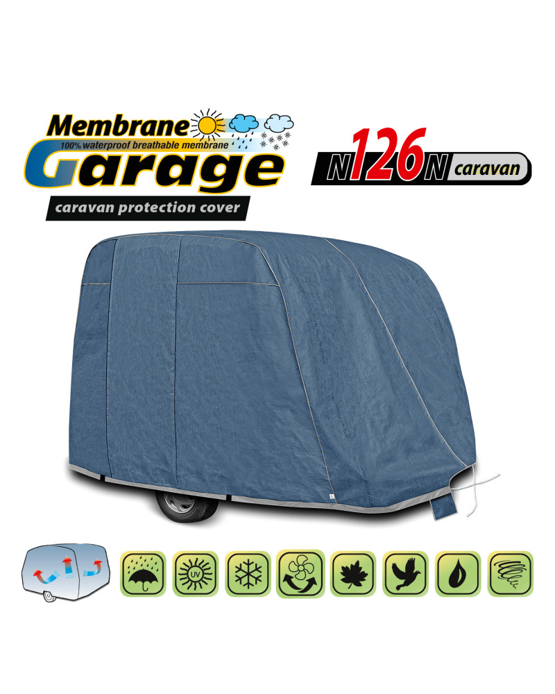 Ušitá z nepremokavej paropriepustnej membrány a neľahko premokavých, veľmi dobre paru prepúšťajúcich látok zaisťuje správny obeh vzduchu vo vnútri plachty. Uchováva si takmer úplnú tesnosť, zároveň zabraňuje hromadeniu vlhkosti vo vnútri plachty. Je dobre prispôsobená. Vďaka svojej konštrukcii a zvláštnym vlastnostiam efektívne chráni celý príves (spoločne s dolnými časťami) pred nepriaznivým vplyvom prostredia. Je odolná voči pôsobeniu UV žiarenia. Chráni pred dažďom, snehom, námrazou, vetrom, peľom rastlín, listami, šťavami zo stromov, vtáčími exkrementami. Zabraňuje blednutiu, zmatneniu laku a chrómovaných dielov. Chráni pred väčšinou poškrabaní. Obmedzuje koróziu. Vďaka silnému pripevneniu s pomocou na spony zapínaných pásov zaručuje bezpečnosť dokonca aj v prípade silných nárazov vetra. Veľmi ľahko sa nasadzuje a skladá a po zložení nezaberie príliš miesta. Z vnútornej strany plachty je materiál hladký, bezpečný pre karosériu a iné časti vozidla – nespôsobuje poškrabanie. Je vyrobená v tmavo popolavej farbe – tlmenej a praktickej, s tmavomodrými detailmi. Membrane Garage je viacsezónny výrobok, ktorý vám bude slúžiť mnoho rokov. Poskytovaná záruka až 30 mesiacov vám dá istotu, že si kupujete výrobok najvyššej kvality.