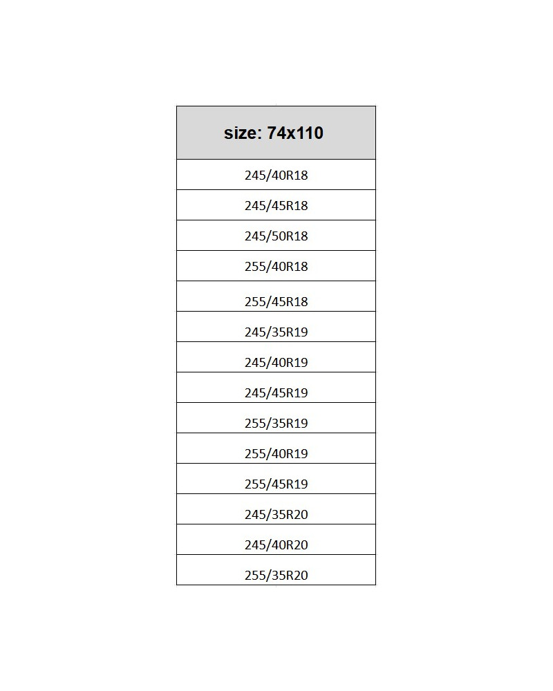 245/40R18, 245/45R18, 245/50R18, 255/40R18, 255/45R18, 245/35R19, 245/40R19, 245/45R19, 255/35R19, 255/40R19, 255/45R19, 245/35R20, 245/40R20, 255/35R20.