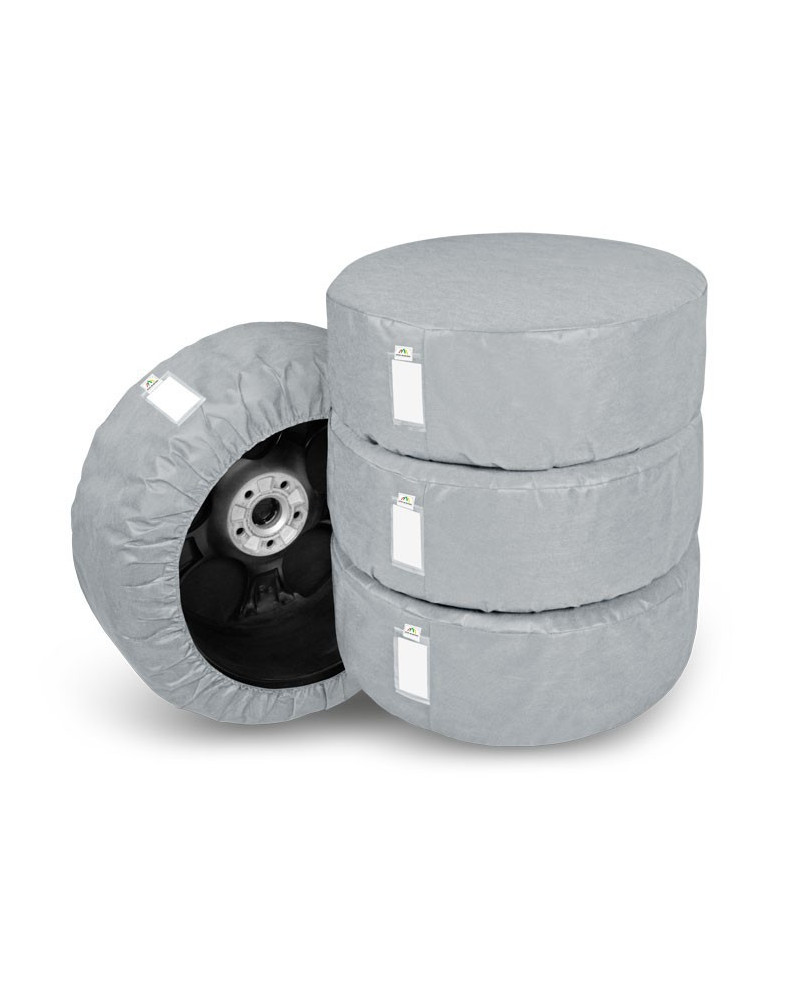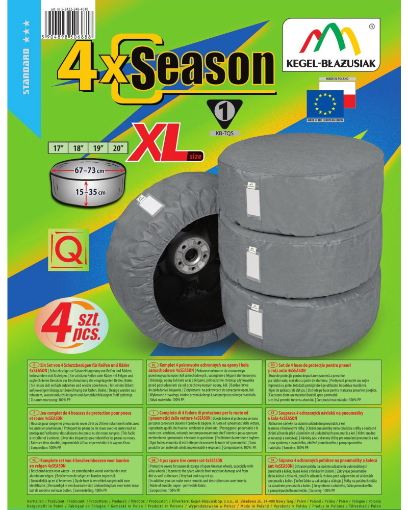 Sada 4 vysoko kvalitných poťahov SEASON – určených na sezónne uskladnenie pneumatík a automobilových kolies, zvlášť tých s hliníkovými diskami (kryjú pneumatiky spolu s diskami). Sú vyrobené z neľahko premokavého, paropriepustného materiálu, ktorý zaisťuje správnu cirkuláciu vzduchu vo vnútri poťahov a zabraňuje vzniku korózie. V garáži vyzerajú veľmi dobre. Neusadzuje sa na nich prach, počas dlhšej prestávky v ich používaní. Po stiahnutí poťahu budú kolesá/pneumatiky ako nové - zostanú v takom stavu, v akom sme ich zanechali. Poťahy veľmi dobre chránia pred znečistením oblečenia počas prenášania kolies. Poťahy majú všité vrecko na etiketu popisujúcu pneumatiky/kolesa. Veľmi ľahko sa nasadzujú a sťahujú.