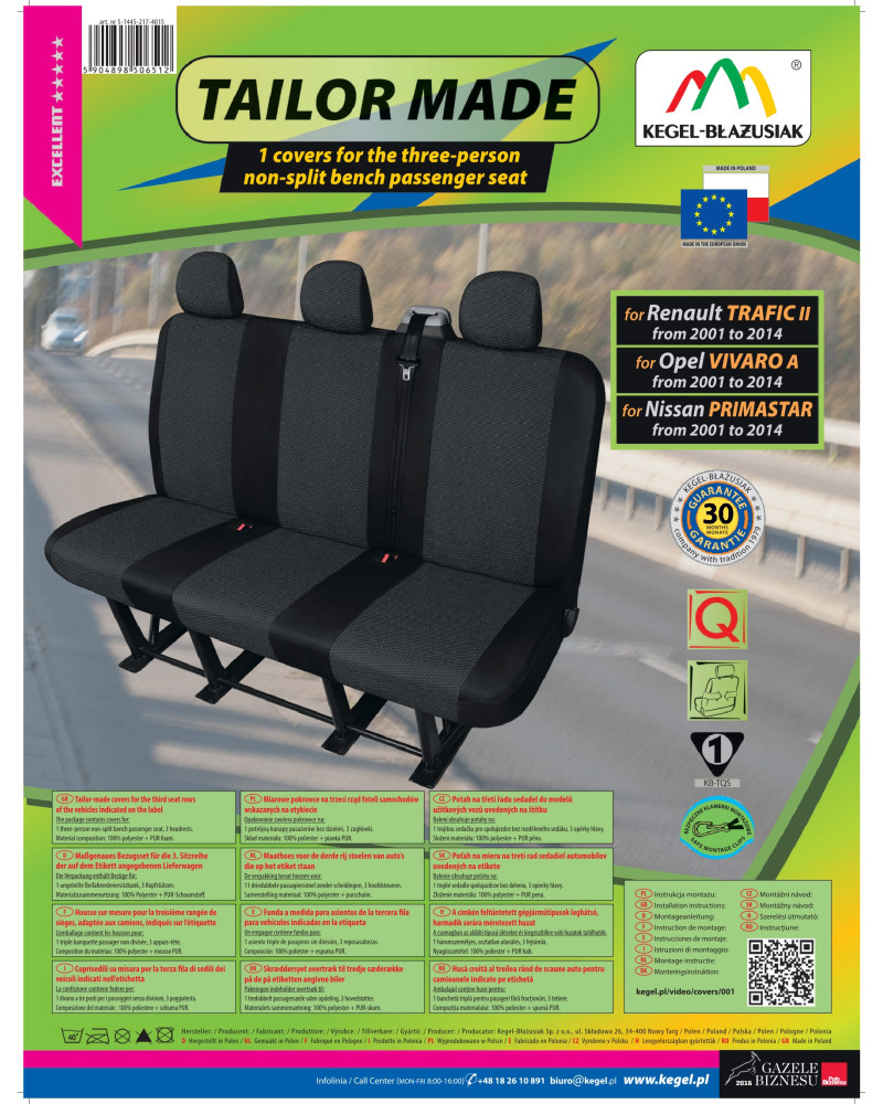 Poťahy sú vybavené nevyhnutným prierezom zapínaným na suchý zips, ktorý umožňuje ich nasadenie bez nutnosti vyťahovať opierky hlavy. Sú prispôsobené pre autá, ktoré majú bezpečnostný pás vystupujúci zo sedadla určeného pre troch spolujazdcov. Poťahy sú zozadu uzatvorené, takže chránia nielen predné čalúnenie ale tiež celú zadnú časť operadla sedadla. Sada je vybavená špeciálnymi sponami a do materiálu sú všité pripevnenia, čo s pomocou priloženého obrázkového návodu na obsluhu zaisťuje veľmi ľahkú montáž. Poťahy sa vyznačujú dlhou životnosťou, odolnosťou voči oteru a ľahkou údržbou. Možno ich bez obáv prať v práčke pri teplote 40°- v súlade s pokynmi na etikete.