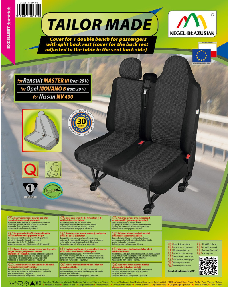 Poťahy sú vybavené nevyhnutným prierezom zapínaným na suchý zips, ktorý umožňuje ich nasadenie bez nutnosti vyťahovať opierky hlavy. Sú prispôsobené pre autá, ktoré majú bezpečnostný pás vystupujúci zo sedadla určeného pre dvoch spolujazdcov. Poťahy sú zozadu uzatvorené, takže chránia nielen predné čalúnenie ale tiež celú zadnú časť operadla sedadla. Sada je vybavená špeciálnymi sponami a do materiálu sú všité pripevnenia, čo s pomocou priloženého obrázkového návodu na obsluhu zaisťuje veľmi ľahkú montáž. Poťahy sa vyznačujú dlhou životnosťou, odolnosťou voči oteru a ľahkou údržbou. Možno ich bez obáv prať v práčke pri teplote 40°- v súlade s pokynmi na etikete.