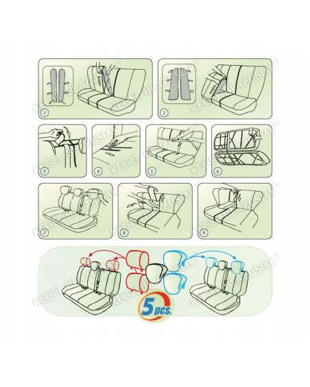 Poťahy sú vybavené nevyhnutným prierezom zapínaným na suchý zips, ktorý umožňuje ich nasadenie bez nutnosti vyťahovať opierky hlavy. Pokiaľ je sedadlo vybavené lakťovými opierkami, umožní ich používanie špeciálny otvor v materiáli. Poťahy sú zozadu uzatvorené, takže chránia nielen predné čalúnenie ale tiež celú zadnú časť sedadla. Ide o vylepšenie predovšetkým pre rodičov malých detí. Vzadu na poťahu na sedadle spolujazdca je všité vrecko, ktoré môže byť nesmierne užitočné. Sada je vybavená špeciálnymi sponami a do materiálu sú všité pripevnenia, čo s pomocou priloženého obrázkového návodu na obsluhu zaisťuje veľmi ľahkú montáž. Poťahy sa vyznačujú dlhou životnosťou, odolnosťou voči oteru a ľahkou údržbou. Možno ich bez obáv prať v práčke pri teplote 40°- v súlade s pokynmi na etikete.
