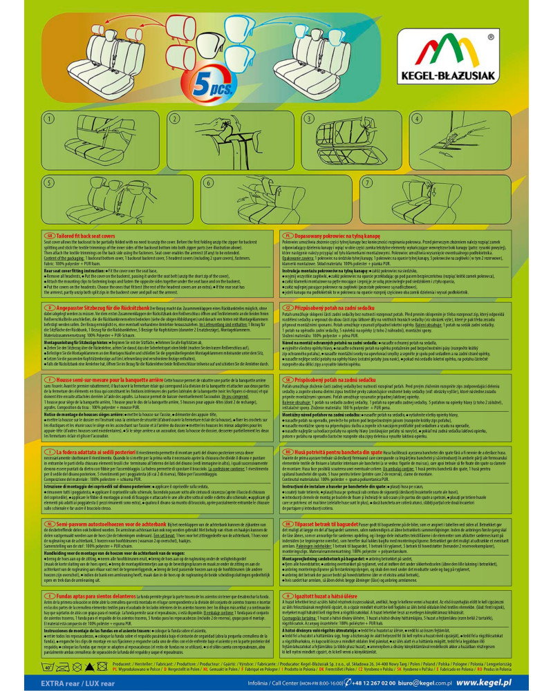 Pri výrobe poťahov bol použitý systém delenia zadných sedadiel, umožňujúci ich zloženie bez nutnosti rozopínať poťah, ich trvalé rozdelenie a rozloženie lakťovej opierky v strednej časti zadného sedadla. Je tomu tak vďaka doplňujúcim prvkom - krytom bokov, ktoré sú spojené s hlavnou časťou materiálu s pomocou zipsov. Sada je vybavená špeciálnymi sponami a do materiálu sú všité pripevnenia, čo s pomocou priloženého obrázkového návodu na obsluhu zaisťuje veľmi ľahkú montáž. Poťahy sa vyznačujú dlhou životnosťou, odolnosťou voči oteru a ľahkou údržbou. Možno ich bez obáv prať v práčke pri teplote 40°- v súlade s pokynmi na etikete.