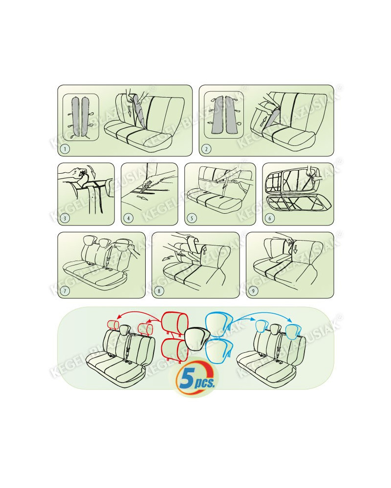 Poťahy predávame v sadách . Na predné sedadlá a na zadné sedadlá. Poťahy sú určené do nových modelov áut, ktoré majú päť opierok hlavy a tretí bezpečnostný pás vystupujúci z operadla zadného sedadla. Otvory na všetky konštrukčné prvky boli dôkladne obstarané a olemované. Konštrukcia poťahov umožňuje ich nasadenie bez nutnosti vyťahovania opierok hlavy. Vďaka úplnému uzatvoreniu poťahov na sedadlá je chránená tiež zadná časť sedadiel. Nasadenie poťahov je veľmi ľahké a prebieha efektívne. Robí sa s pomocou špeciálnych montážnych spôn pripevnenia všitých do materiálu. Poťahy sa ľahko čistia, pretože ich možno vyprať, v súlade s informáciou na etikete, - na 40°.