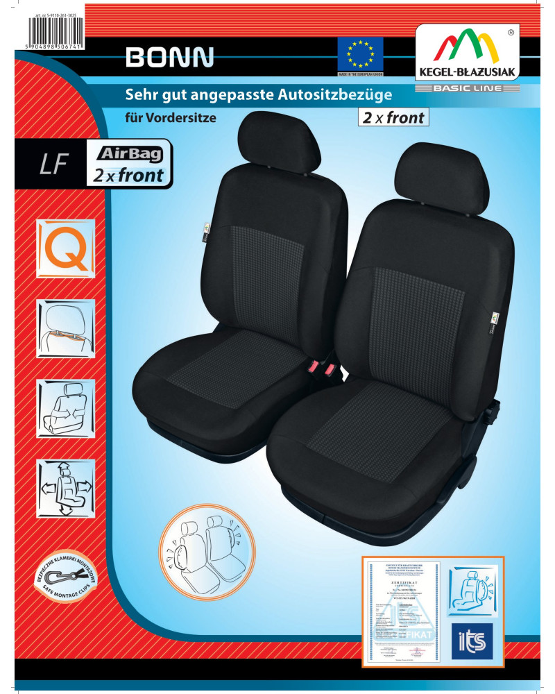 Univerzálne prispôsobené poťahy BONN to sú veľmi atraktívne a elegantné poťahy, ktoré môžete získať za skutočne nízku cenu. Vďaka vhodnej konštrukcii a laminácii na vnútornej strane PUR penou dobre priľnú k samotnému čalúneniu sedadiel. Vyrobené s ohľadom na konkrétne modely áut, dobre sa prispôsobujú sedadlám a okrem toho zaisťujú komfort používania. Sú vyrobené zo silného, stáleho žakárového materiálu a zaručujú tak skutočne dlhú dobu používania. Pokiaľ chcete osviežiť interiér svojho automobilu, aby bol viac šik a dodať mu eleganciu - ste tu teda správne. Poťahy sú zhotovené zo silného žakárového čalúnnického materiálu vysokej kvality. Udržujú si tmavú, grafitovú farebnosť. Povrch materiálu je z polovice jednoliaty - v strede sa vyskytuje jemný vzor (kocka) - tkaný popolavou niťou. Vďaka tomu vyzerá poťah aj napriek svoj jemný, tónovaný štýl zaujímavo. Poťahy na predné sedadlá sú vzadu úplne uzatvorené - to umožňuje chrániť sedadlá tiež zo zadnej strany. Poťahy BONN ponúkame za veľmi atraktívnu cenu. Vyplatí sa však uviesť, že kvalita prevedenia v ničom nezaostáva za drahšími modelmi.